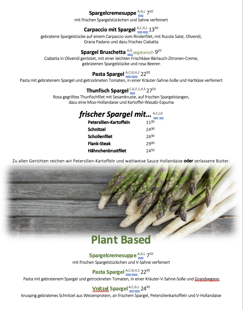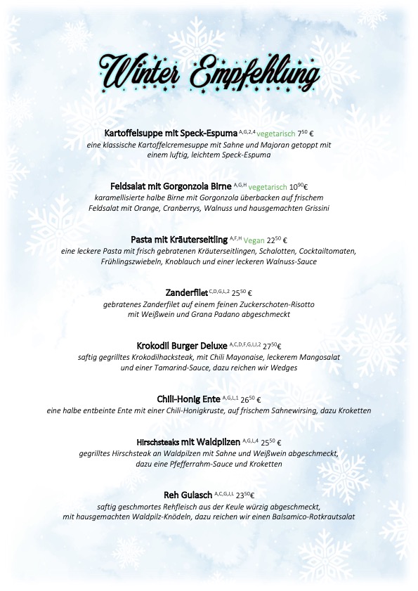 Auf unserer Saisonkarte finden Sie frische Gerichte, die perfekt zur aktuellen Jahreszeit passen. Genießen Sie kulinarische Kreationen, die mit regionalen und saisonalen Zutaten zubereitet werden und für ein unvergleichliches Geschmackserlebnis sorgen. Lassen Sie sich von den wechselnden Spezialitäten überraschen und entdecken Sie immer wieder neue, leckere Highlights, die die Saison zu bieten hat.